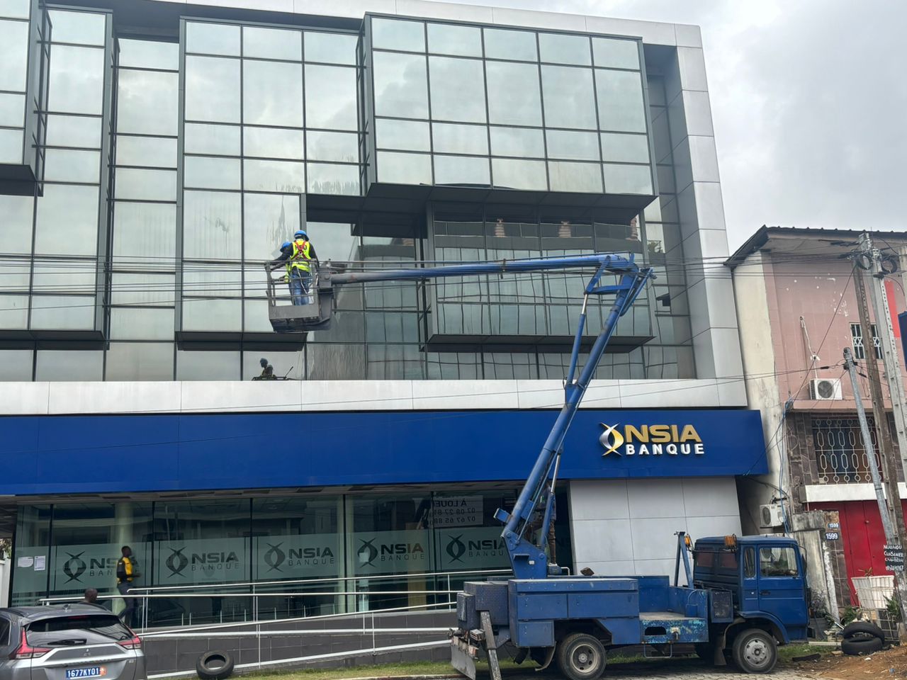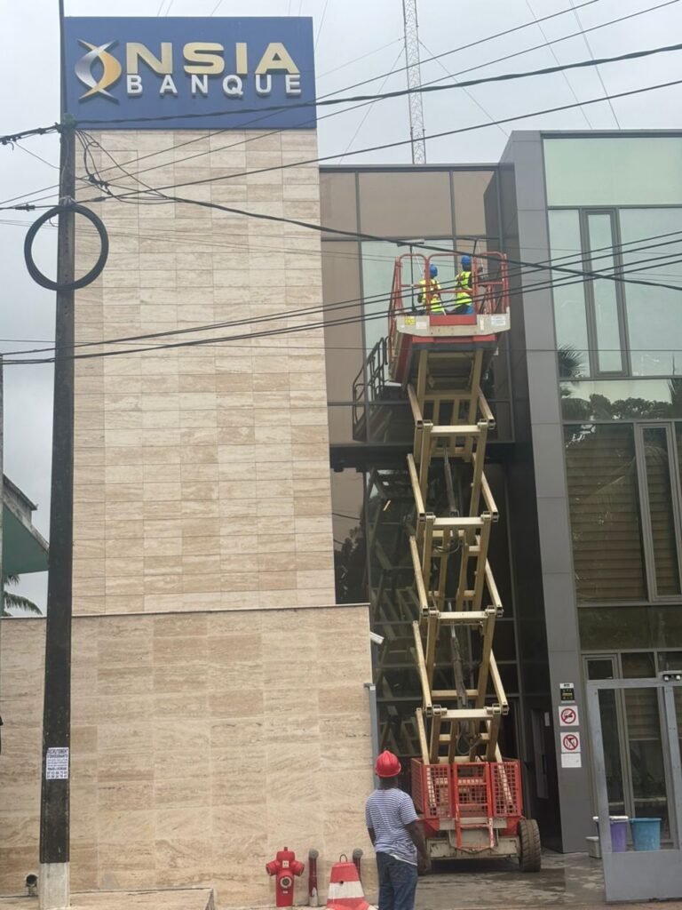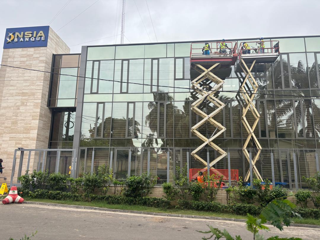 Nettoyage de façades NSIA Banque avec nacelles.